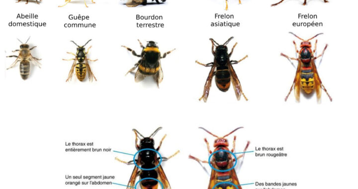 * Sus au frelon asiatique ! Les pièges doivent être posés de fin février à la mi-mai. Commençons par le reconnaître. Le frelon asiatique est plus petit que le frelon européen (3 cm de long). Sa tête est noire avec la face jaune orangée. Son thorax est brun foncé et son abdomen brun présente de fines bandes jaunes. L’extrémité de ses pattes est jaune (Voir photo). Ensuite, il faut confectionner un piège sélectif pour éviter de capturer d’autres insectes. Pour cela prendre une bouteille en plastique et faire des orifices de 5 mm permettant aux petits insectes (guêpes, abeilles…) de s’échapper et 2 trous d’entrée suffisamment large (9 mm) pour laisser passer le frelon asiatique mais trop étroit pour le frelon européen et les papillons.