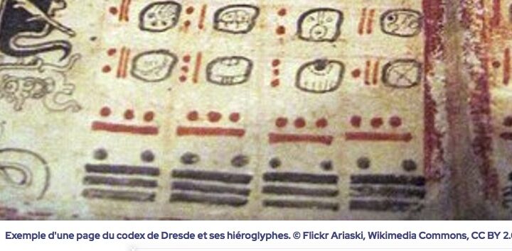 * Les mayas visionnaires ? On trouve des traces de la civilisation Maya jusqu’à 2000 ans avant JC, l’apogée s’étalant entre 250 et 900 ans après JC. Bien que beaucoup d’ouvrages aient disparu suite à la destruction systématique des livres indigènes par les colons espagnols au XVIᵉ siècle, les scientifiques ont pu examiner un manuscrit précolombien, le célèbre codex de Dresde, qui est l’un des quatre codex mayas rescapés. Ils ont découvert que les prédictions astronomiques n’étaient pas le fruit du hasard, mais le résultat d’un système de calcul complexe alliant rigueur mathématique et cosmologie sacrée (Voir photo).